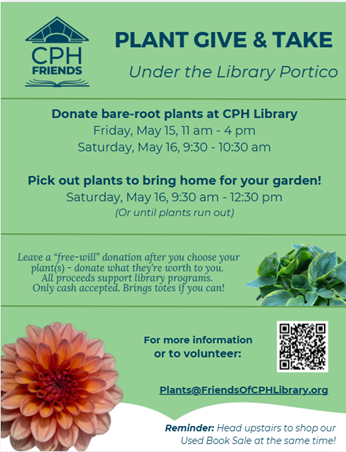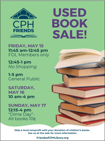 IMPORTANT NOTICE: Donations for the CPH Friends Used Books Sales must be placed on the designated cart in the Library. Items placed in the Better World Books donation bin found at the far end of the library parking lot do not go to supporting the work of the Friends.